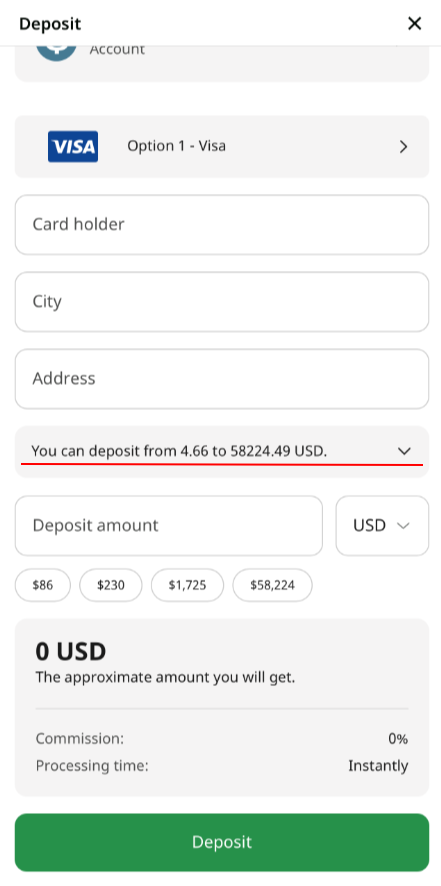 Please be aware that there might be certain minimum and maximum limits set by the payment system itself. The exact limits will be stated on the deposit page directly.