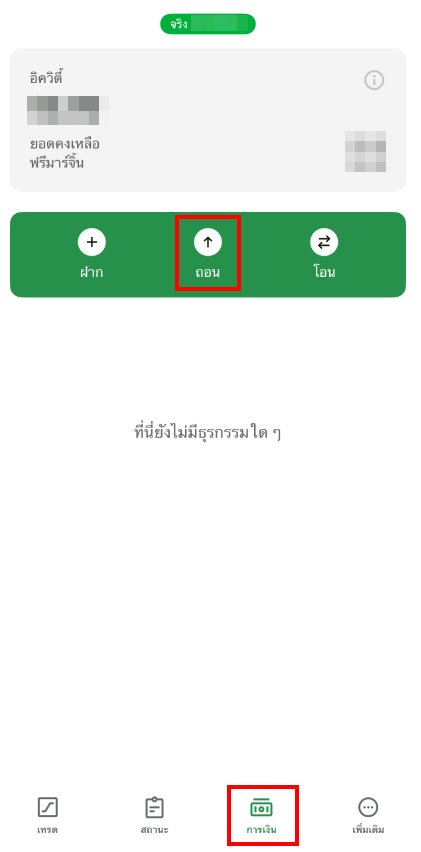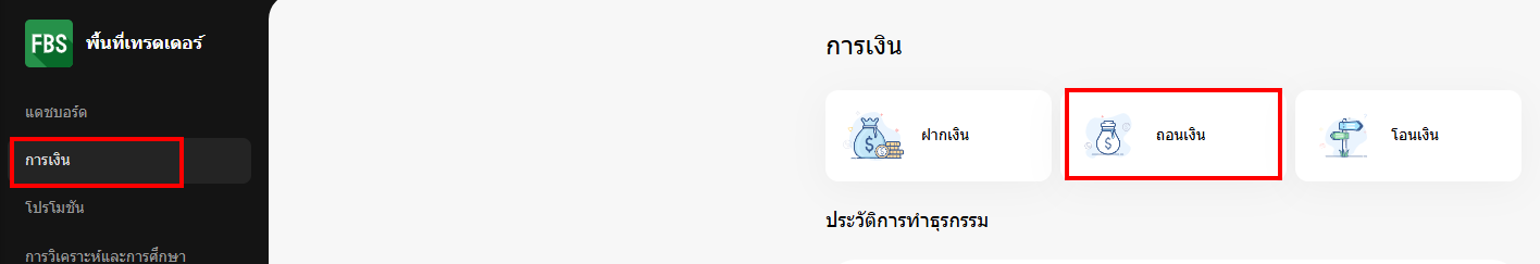1. เปิดแท็บ "การเงิน" แล้วเลือก "ถอนเงิน" ตามภาพ